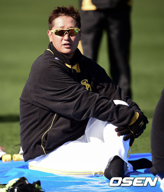 1일 오후 일본 미야자키(宮崎) 이키메노모리 운동공원 내 아이비스타디움에서 진행된 일본 프로야구 소프트뱅크 스프링캠프, 이대호가 스트레칭을 하고 있다.