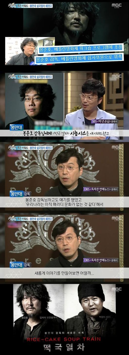 이어 봉만대 감독의 소식은 봉준호 감독의 영화 '설국열차'를 패러디한 '떡국열차'의 소식. 봉만대 감독은 "봉준호 감독님에게 '떡국열차' 시놉시스를 얘기해드렸다"며 "우리나라는 아직 패러디 문화가 없는 것 같다. 새롭게 이야기를 만들어보면 어떨까"하며 봉 감독끼리 나눈 이야기를 공개했다.