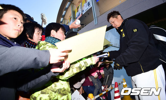 1일 오후 일본 미야자키(宮崎) 이키메노모리 운동공원 내 아이비스타디움에서 진행된 일본 프로야구 소프트뱅크 스프링캠프, 이대호가 훈련뒤 팬들에게 사인을 하고 있다.
