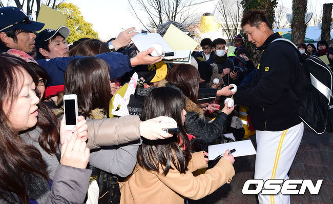1일 오후 일본 미야자키(宮崎) 이키메노모리 운동공원 내 아이비스타디움에서 진행된 일본 프로야구 소프트뱅크 스프링캠프, 이대호가 훈련뒤 팬들에게 사인을 하고 있다.