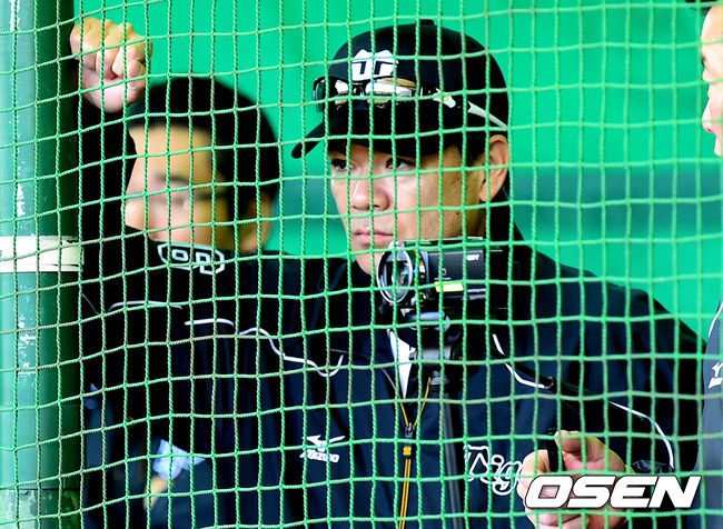 한신 와다 감독이 선수들의 불펜피칭을 바라보고 있다.