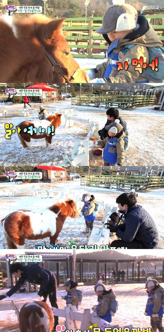 대한이는 처음에 "아빠가 줘"라고 말하며 당근을 들고 아빠의 도움을 요청했다. 아빠 송일국이 같이 당근을 잡으며 도와주자 용기를 내며 말에게 당근을 내밀었다. 송일국은 "대한이가 줬어"라고 대한이에게 자신감을 심어줬다.