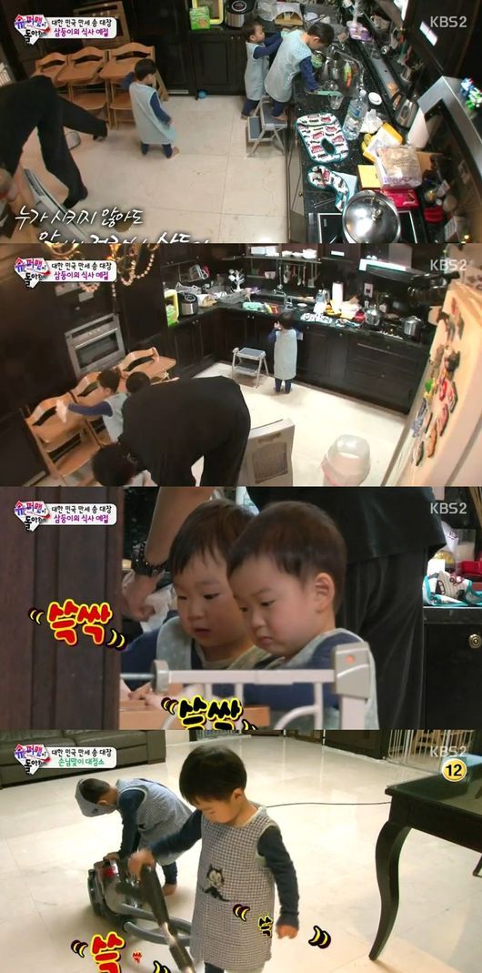 이후 송일국은 사랑이 방문에 대비해 청소를 시켰고, 삼둥이는 아빠를 도와 청소도 열심히 하는 기특한 모습을 보였다.