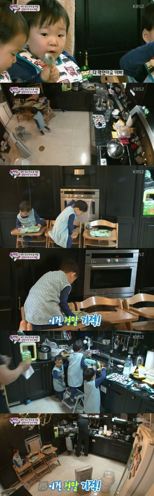 1일 방송된 KBS 2TV 예능프로그램 ‘해피선데이-슈퍼맨이 돌아왔다’에서는 밥을 먹은 후 식판을 정리하는 송일국과 대한 민국 만세의 모습이 그려졌다.