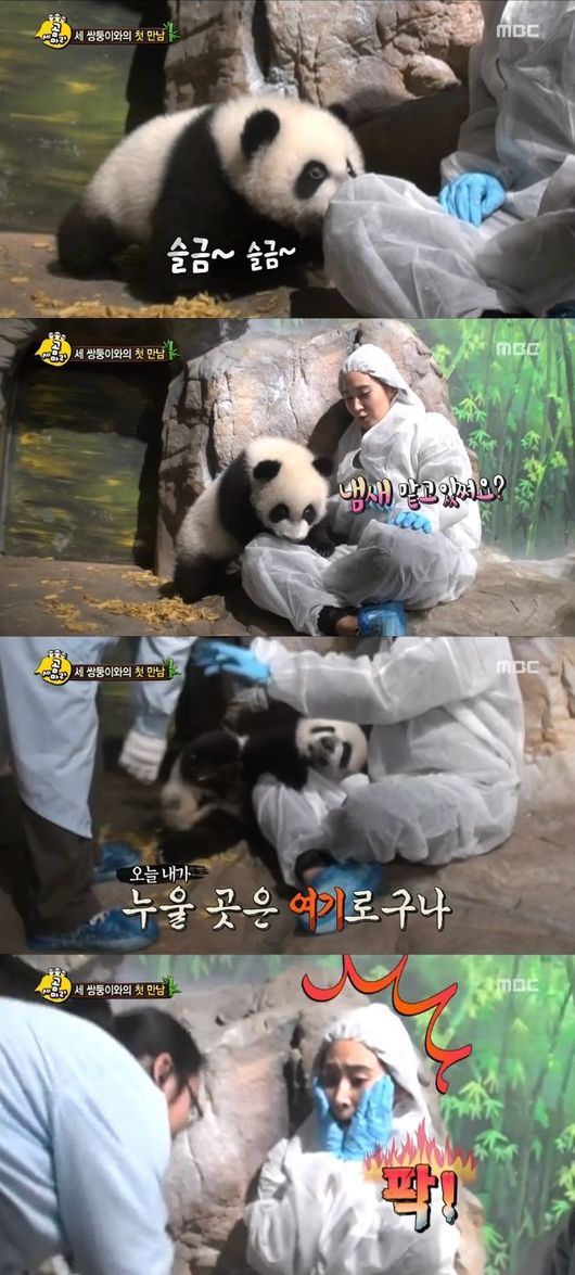 1일 오후 4시 50분 방송된 MBC '일밤-애니멀즈'에서는 곰세마리 멤버들이 중국 세 쌍둥이 판다와 만난 모습이 담겼다.