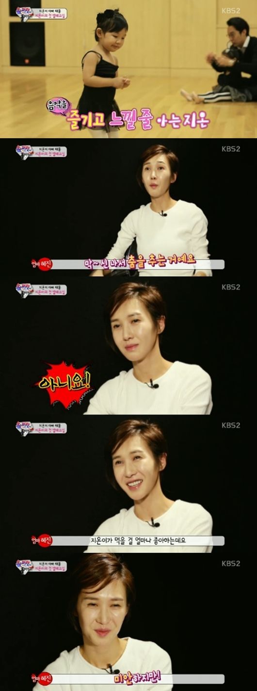 이날 엄지온의 엄마 윤혜진은 “발레단에 한 번 데려간 적이 있다. 노래를 듣더니 무대 중앙으로 가서 춤을 추더라. 음악성도 있었다”고 자랑했다.