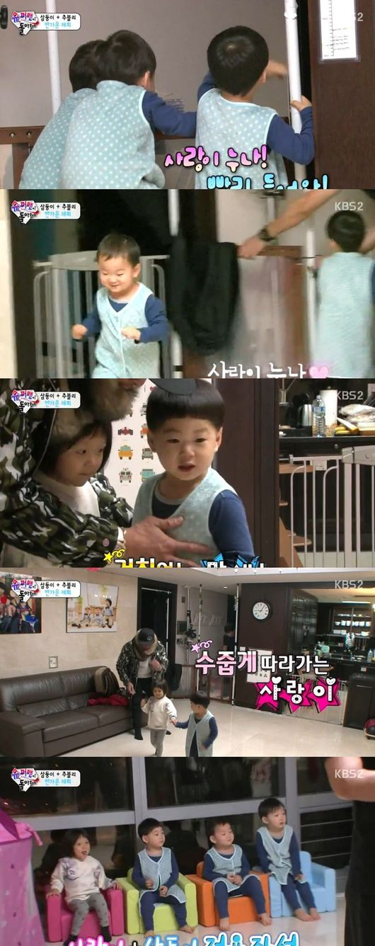 1일 방송된 KBS '슈퍼맨이 돌아왔다'에서는 삼둥이네를 방문한 추성훈과 사랑이의 모습이 그려졌다. 사랑이가 도착하기 전 삼둥이는 청소를 열심히 하고 의자도 하나 더 준비하는 등 분주한 모습을 보였다.