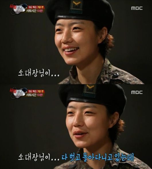 이날 소대장은 샤워 시간으로 10분을 부여했다. 안영미는 "우리는 다 벗고 씻고 있는데, 소대장님이 옷을 갖춰 입고 우리를 관찰했다. 조금 민망했다"고 웃어보였다.