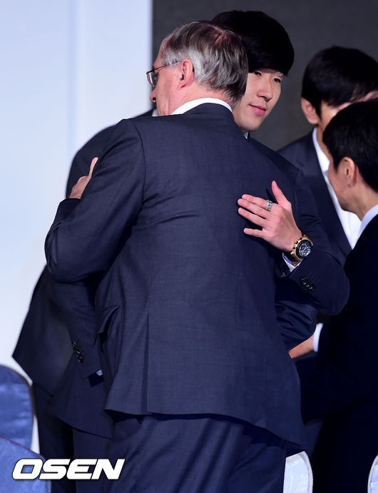대표팀 귀국 환영식에서 손흥민과 슈틸리케 감독이 포옹을 나누고 있다.