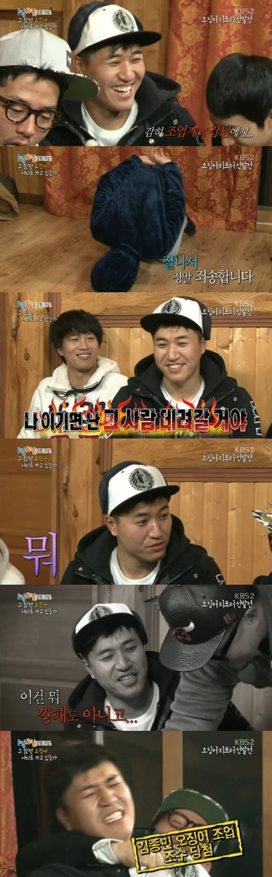 하지만 게임이 이어지며 데프콘, 김준호 등이 치고 올라왔고, 김종민과 강력한 서열 다툼을 하는 모습으로 웃음을 안겼다. 김종민은 김준호의 구박에도 “왜, 뭐?”라고 막나가는 모습으로, 수틀리면 조업에 데려가겠다는 인상을 강력하게 풍겨 웃음을 자아냈다. 처음 보는 김종민의 횡포에 PD들도 조업 촬영에 끌려가지 않기 위해 조심하는 모습. 하지만 조업 당첨자는 김준호였다. 갑질에 신났던 김종민은 단숨에 찬밥이 되면서 좌중을 폭소케 했다. 또한 김준호는 김종민을 조업 파트너로 선정해 큰 웃음을 안겼다.