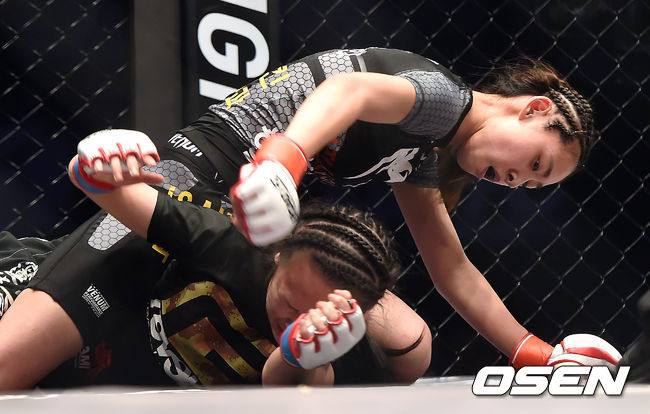 박지혜가 이리에 미유에게 파운딩 펀치를 날리고 있다./youngrae@osen.co.kr