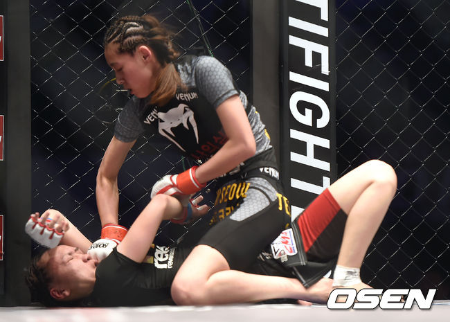박지혜가 이리에 미유에게 파운딩 펀치를 날리고 있다./youngrae@osen.co.kr