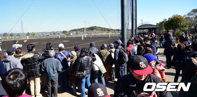 1일 오후 일본 미야자키(宮崎) 이키메노모리 운동공원 내 아이비스타디움에서 진행된 일본 프로야구 소프트뱅크 스프링캠프,마쓰자카를 보기 위해 훈련장을 찾은 팬들이 사진을 찍고 있다.