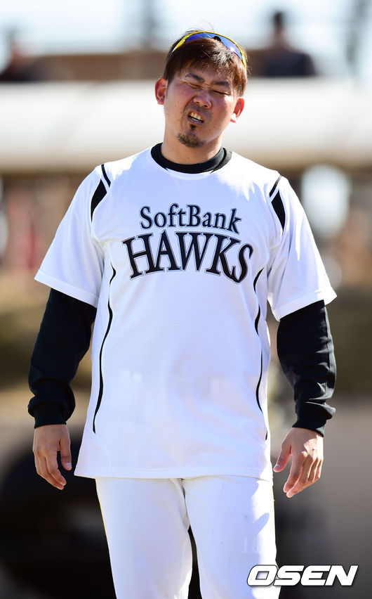 1일 오후 일본 미야자키(宮崎) 이키메노모리 운동공원 내 아이비스타디움에서 진행된 일본 프로야구 소프트뱅크 스프링캠프,마쓰자카가 훈련 중 인상을 쓰고 있다