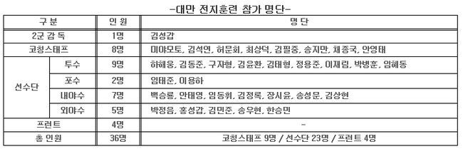 이번 2군 대만 전지훈련은 김성갑 2군 감독을 포함해 선수단과 프런트 총 36명으로 구성되었으며, 투수 및 포수조가 3일, 야수조가 6일 각각 오전 11시 OZ711편을 이용하여 인천공항을 통해 대만 타이난으로 출국한다.