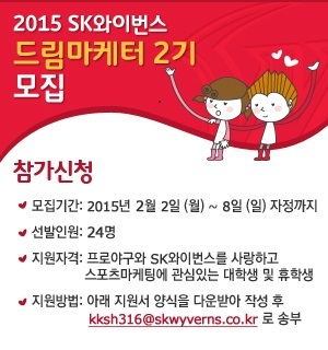드림마케터는 1차 서류심사, 2차 면접을 통해 최종 24명이 선발될 계획이다. 지원 자격은 SK와이번스를 사랑하고 스포츠마케팅에 관심 있는 대학생(휴학생 포함)이라면 누구나 가능하다.
