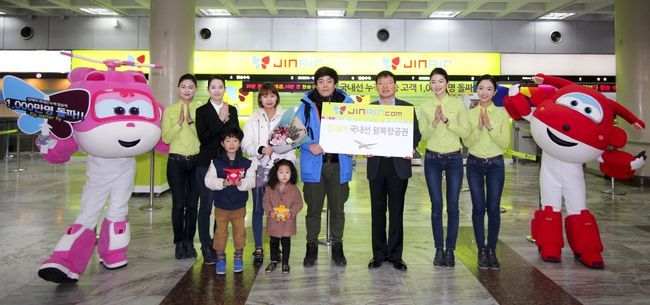 진에어는 이날 김포공항 국내선 청사 2층에서 마원 진에어 대표가 참석한 가운데 진에어 국내선 누적 1000만번째 탑승객 환영 행사를 갖고 김포발 제주행 LJ307편에 탑승하는 강선미(32) 씨 가족에게 김포~제주 노선 무료 왕복 항공권 2매를 전달했다. 이와 함께 김포공항 이용객들에게 국내선 누적 탑승객 1000만명 돌파를 기념하는 기념품을 나눠주는 행사도 함께 진행됐다.