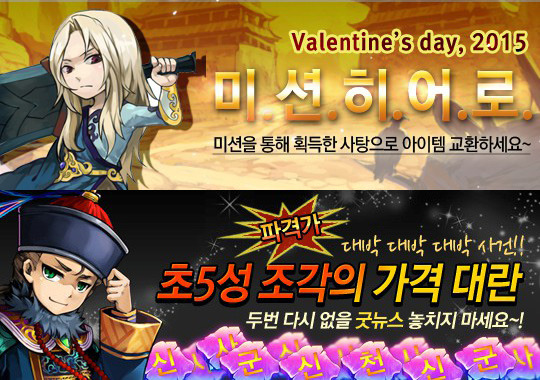 마지막으로 오는 15일까지 출석, 협객 수집, 원보 누적 소비 미션을 통해 획득한 사탕으로 한정판 5성 카드인 ‘열애’ 양서광 협객 카드 및 조화단 등의 아이템과 교환할 수 있는 발렌타인데이 이벤트도 함께 실시한다.