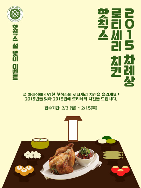 가계의 설 차례음식 준비와 비용 부담을 덜어주기 위해 사전예약 고객에 한해 핫칙스 매장에서 1만 3200원에 판매 중인 로티세리 치킨을 80% 이상 파격 할인된 2015원에 판매하는 행사다.