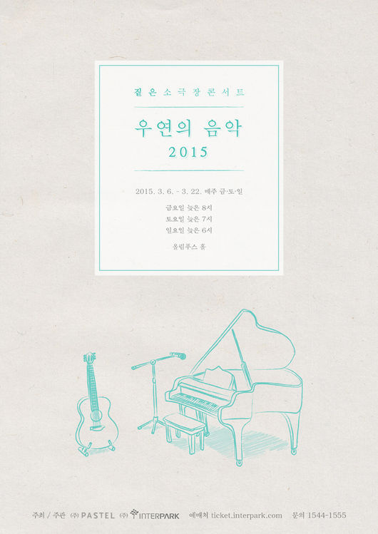 3월 6일부터 22일까지 올림푸스홀에서 개최되는 짙은의 장기 소극장 콘서트 ‘우연의 음악 2015’는 매주 금, 토, 일요일 개최된다. 금요일은 오후 8시, 토요일은 7시, 일요일은 5시.