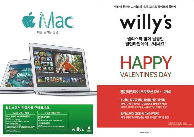 애플 리셀러 윌리스(Willy’s)는 신학기와 밸런타인데이를 맞아 다양한 소비자층을 겨냥한 맞춤형 프로모션을 진행한다고 2일 밝혔다.