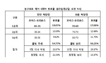 2014-15시즌 KBL 모비스-오리온스전 대상 농구토토 매치 6회차 투표율 중간집계