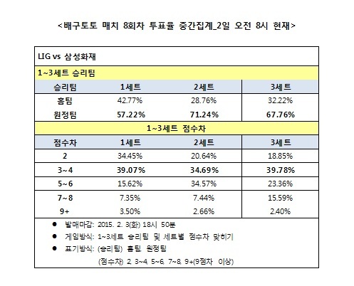 국민체육진흥공단(www.kspo.or.kr)이 발행하는 체육진흥투표권 수탁사업자 공식 인터넷 발매사이트 베트맨(www.betman.co.kr)은 오는 3일(화)에 구미박정희체육관에서 열리는 2014-2015시즌 V-리그 LIG-삼성화재전을 대상으로 하는 배구토토 매치 8회차 게임 투표율 중간집계 결과, 배구팬들은 삼성화재가 LIG를 상대로 우세한 경기를 펼칠 것으로 예상했다.