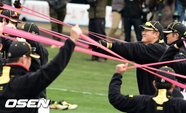 2일 오후 일본 미야자키(宮崎) 이키메노모리 운동공원 내 아이비스타디움에서 진행된 일본 프로야구 소프트뱅크 스프링캠프, 이대호가 밴드운동을 하고 있다.