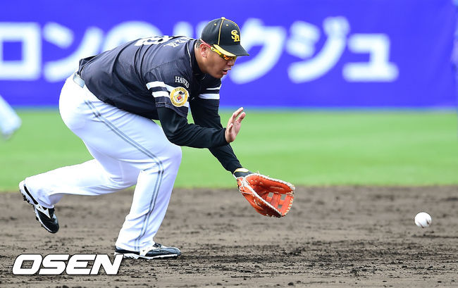 2일 오후 일본 미야자키(宮崎) 이키메노모리 운동공원 내 아이비스타디움에서 진행된 일본 프로야구 소프트뱅크 스프링캠프, 이대호가 수비훈련을 하고 있다.
