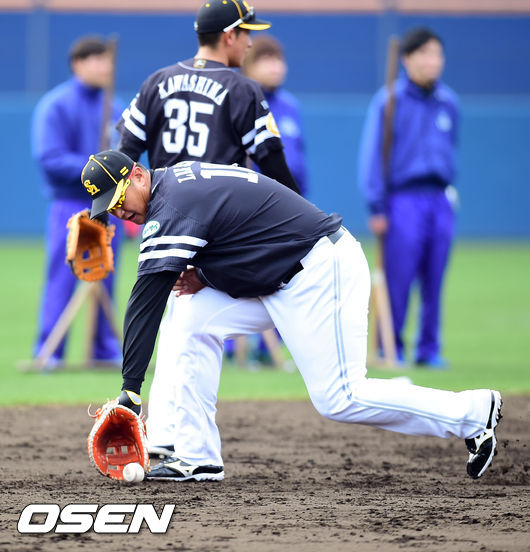 2일 오후 일본 미야자키(宮崎) 이키메노모리 운동공원 내 아이비스타디움에서 진행된 일본 프로야구 소프트뱅크 스프링캠프, 이대호가 수비훈련을 하고 있다.