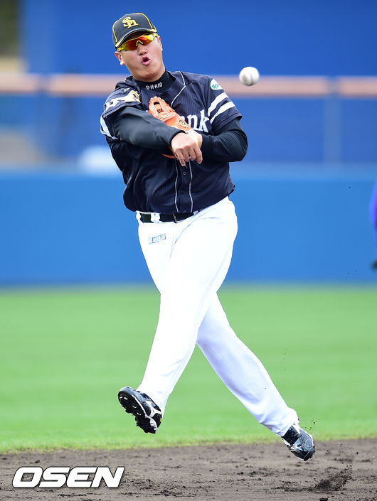 2일 오후 일본 미야자키(宮崎) 이키메노모리 운동공원 내 아이비스타디움에서 진행된 일본 프로야구 소프트뱅크 스프링캠프, 이대호가 수비훈련을 하고 있다.