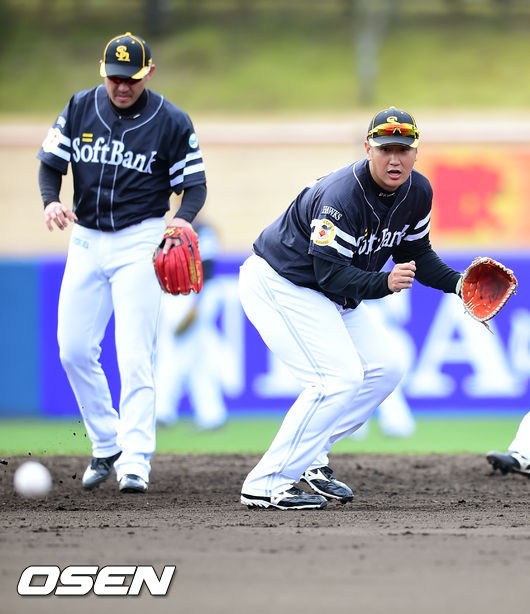 2일 오후 일본 미야자키(宮崎) 이키메노모리 운동공원 내 아이비스타디움에서 진행된 일본 프로야구 소프트뱅크 스프링캠프, 이대호가 수비훈련을 하고 있다.