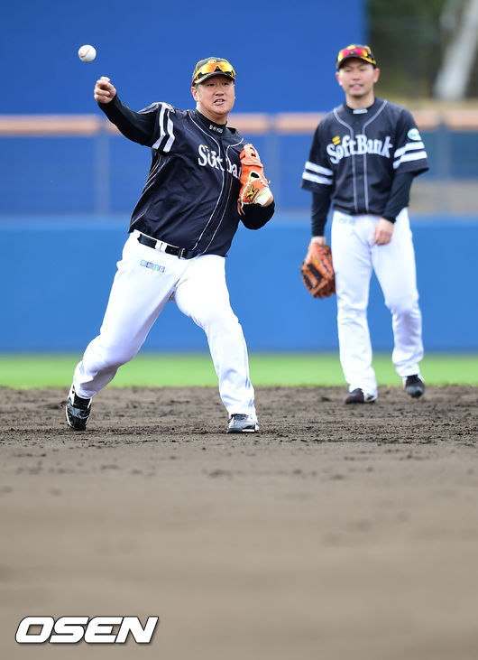 2일 오후 일본 미야자키(宮崎) 이키메노모리 운동공원 내 아이비스타디움에서 진행된 일본 프로야구 소프트뱅크 스프링캠프, 이대호가 수비훈련을 하고 있다.