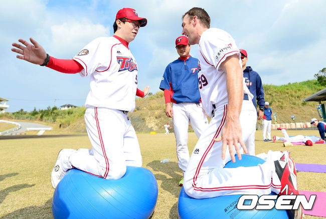 KIA 새 외국인투수 필립 험버와 양현종이 짐볼을 이용한 밸런스 훈련을 진행하고 있다.