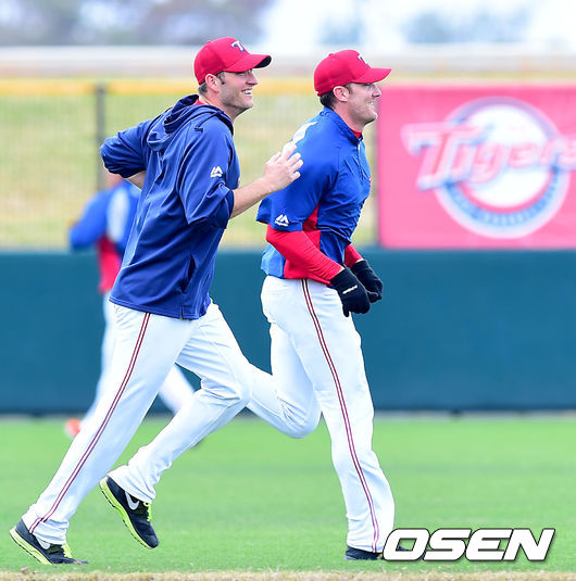 KIA의 새로운 외국인투수 필립 험버와 조쉬 스틴슨이 달리기로 몸을 풀고 있다.