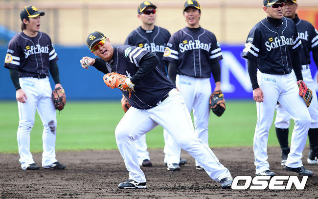 2일 오후 일본 미야자키(宮崎) 이키메노모리 운동공원 내 아이비스타디움에서 진행된 일본 프로야구 소프트뱅크 스프링캠프, 이대호가 수비훈련을 하고 있다.