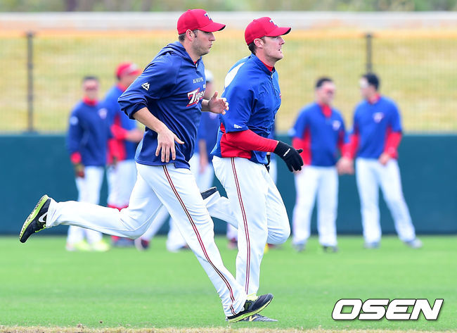KIA의 새로운 외국인투수 필립 험버와 조쉬 스틴슨이 달리기로 몸을 풀고 있다.