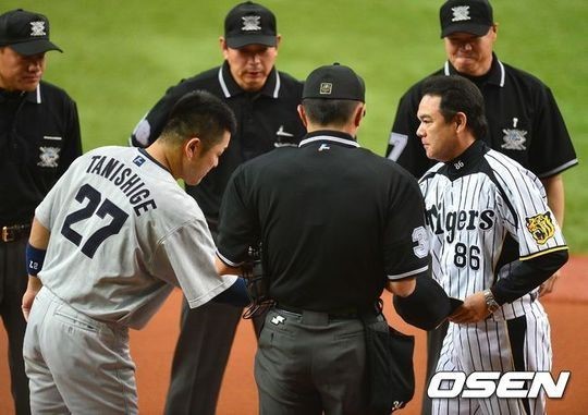 지난해 4월 한신 타이거스와 주니치 드래건스의 경기를 앞두고 와다 유타카 감독과 다니시게 모토노부 감독이 악수를 나누고 있다.