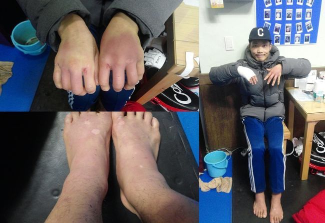 먼저 최무겸은 "온 몸이 만신창이가 된 것 같다. 오른쪽 주먹이 부러졌고, 왼쪽 손등은 많이 부었다. 손가락 밖에 안 움직여 진다. 그리고 양쪽 발등이 완전 부었다"고 투혼의 결과를 전했다.
