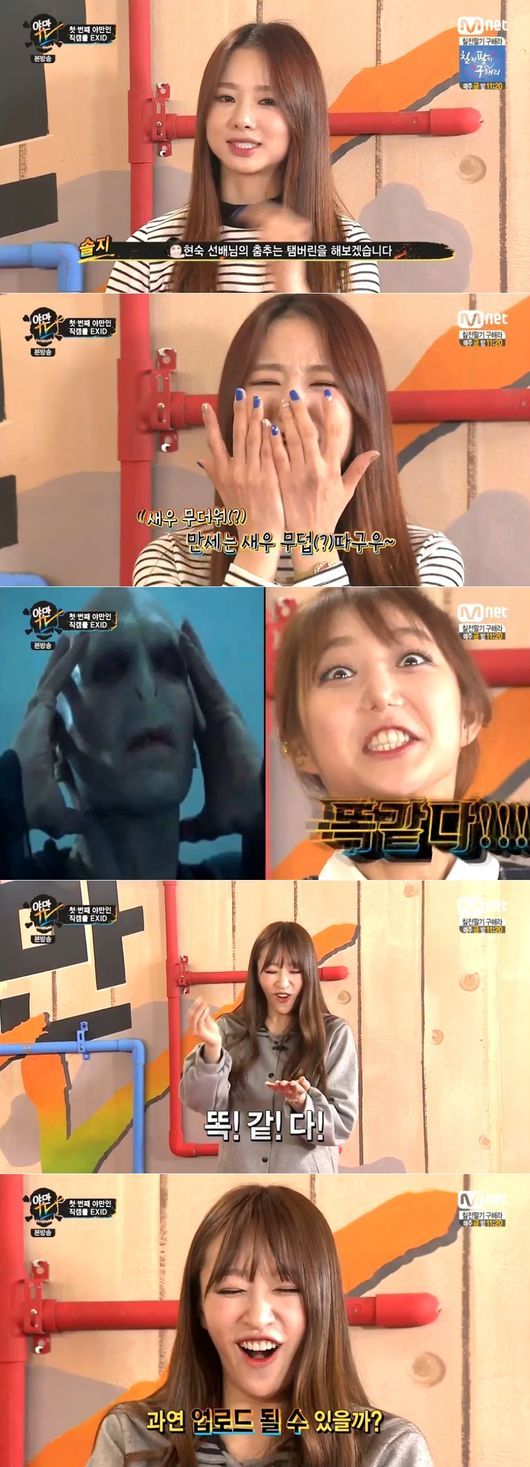 EXID는 2일 오후 방송된 Mnet 예능프로그램 ‘야만TV’에 게스트로 출연했다. 이날 ‘야망 동영상’을 위한 후보로 오른 솔지, 혜린, 하니는 각각 다른 개인기로 스튜디오를 웃음바다로 만들었다.