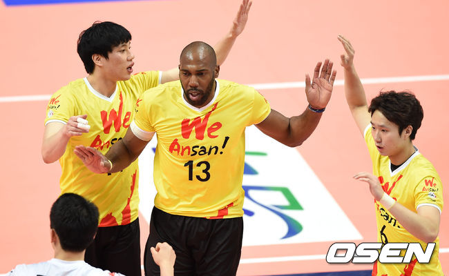 1세트 득점에 성공한 OK저축은행 시몬이 동료들과 환호하고 있다.
