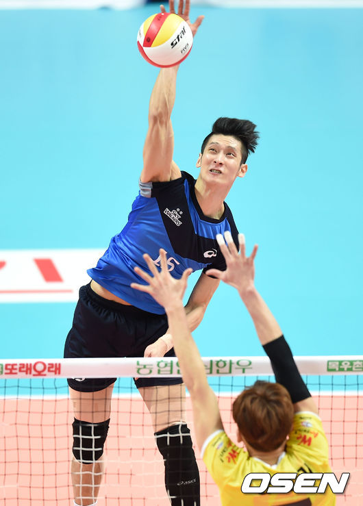1세트 현대캐피탈 문성민이 OK저축은행의 블로킹 벽을 피해 공격을 시도하고 있다.