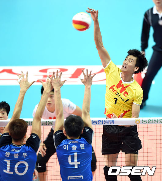 1세트 OK저축은행 송명근이 현대캐피탈의 블로킹 벽을 피해 공격을 시도하고 있다.