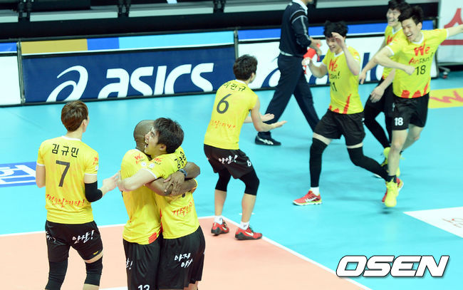 경기 종료 후 OK저축은행 선수들이 승리의 기쁨을 나누고 있다. /sunday@osen.co.kr