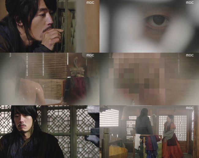 이후 목간(목욕탕)으로 들어간 개봉을 따라간 왕소는 경(정우식)의 벗은 몸을 개봉으로 착각하고 그를 남자라고 확신한다. 이 과정에서 경의 중요부위가 모자이크 처리해 등장, 눈길을 사로잡았다.