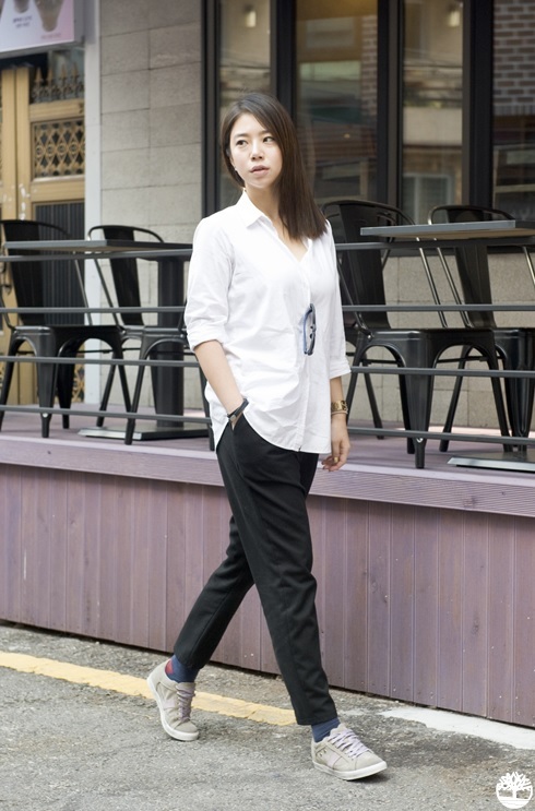 또한 여기에 화이트 셔츠를 함께 매치하면 최근 유행하고 있는 꾸민 듯 안꾸민 듯 한 놈코어 룩도 연출 할 수 있다.