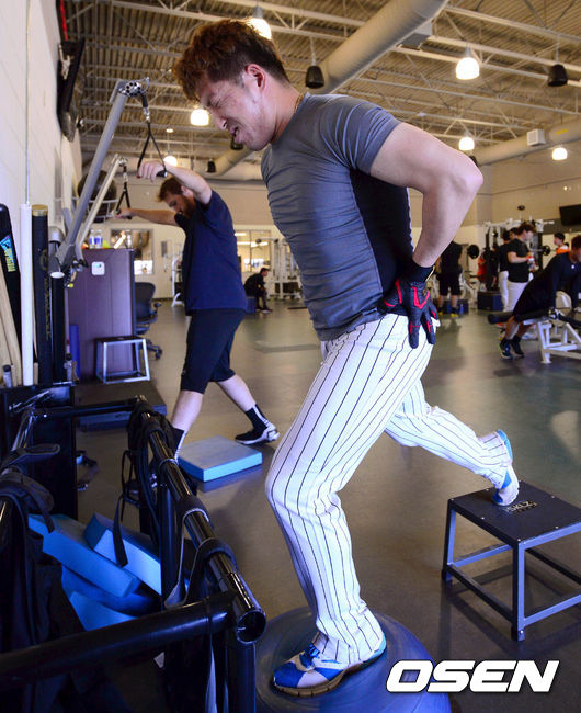 전지훈련지 애리조나에서 선수들은 타격,투구 등 개인 기량만이 아니라 웨이트 트레이닝을 통해 한 시즌을 지탱할 근육 만들기에 힘쓰고 있다.롯데 김승회가 하체 훈련을 하며 고통스러워 하고 있다.