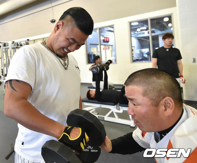전지훈련지 애리조나에서 선수들은 타격,투구 등 개인 기량만이 아니라 웨이트 트레이닝을 통해 한 시즌을 지탱할 근육 만들기에 힘쓰고 있다.롯데 송승준이 팔 근력을 키우는 웨이트 트레이닝을 하고 있다.