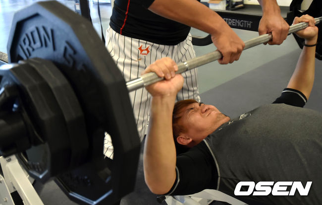 전지훈련지 애리조나에서 선수들은 타격,투구 등 개인 기량만이 아니라 웨이트 트레이닝을 통해 한 시즌을 지탱할 근육 만들기에 힘쓰고 있다.롯데 장성우가 강민호의 도움을 받아 웨이트 트레이닝을 하고 있다.