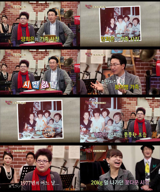 양희은은 “1977년 첫 아이를 낳고 나서 찍었던 사진이다. 출산 직 후 붓기가 덜 빠진 모습이 저 정도였는데, 그 전에는 어땠겠나. 나도 젊은 시절엔 한 미모 했었다”며 너스레를 떨었다. 또 동생 양희경에 대해서도 “믿기 어렵겠지만, 저 당시 동생도 지금보다 20kg은 덜 나가던 꽃다운 시절이었다”고 말해 현장을 다시 한 번 폭소케 만들었다.